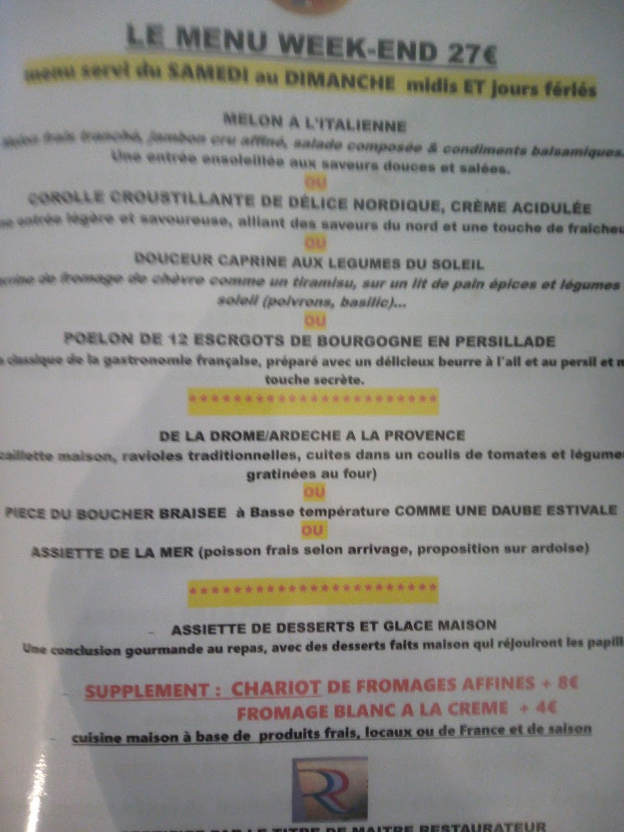 Menu servi le week-end et jours fériés entrée au choix + plat au choix + assiette de minis desserts Tiramisu Provençal ou Délices nordique ou Poêlon de 12 escargots de Bourgogne en persillade ou entrée du moment Magret de canard, jus miel et orange ou Pièce du boucher (suggestion sur ardoise) ou Assiette de la mer (suggestion sur ardoise) assiette de minis desserts maison Supplément dans ce menu Chariot de fromages affinés + 7 euros Faisselle de fromage blanc à la crème + 4 euros