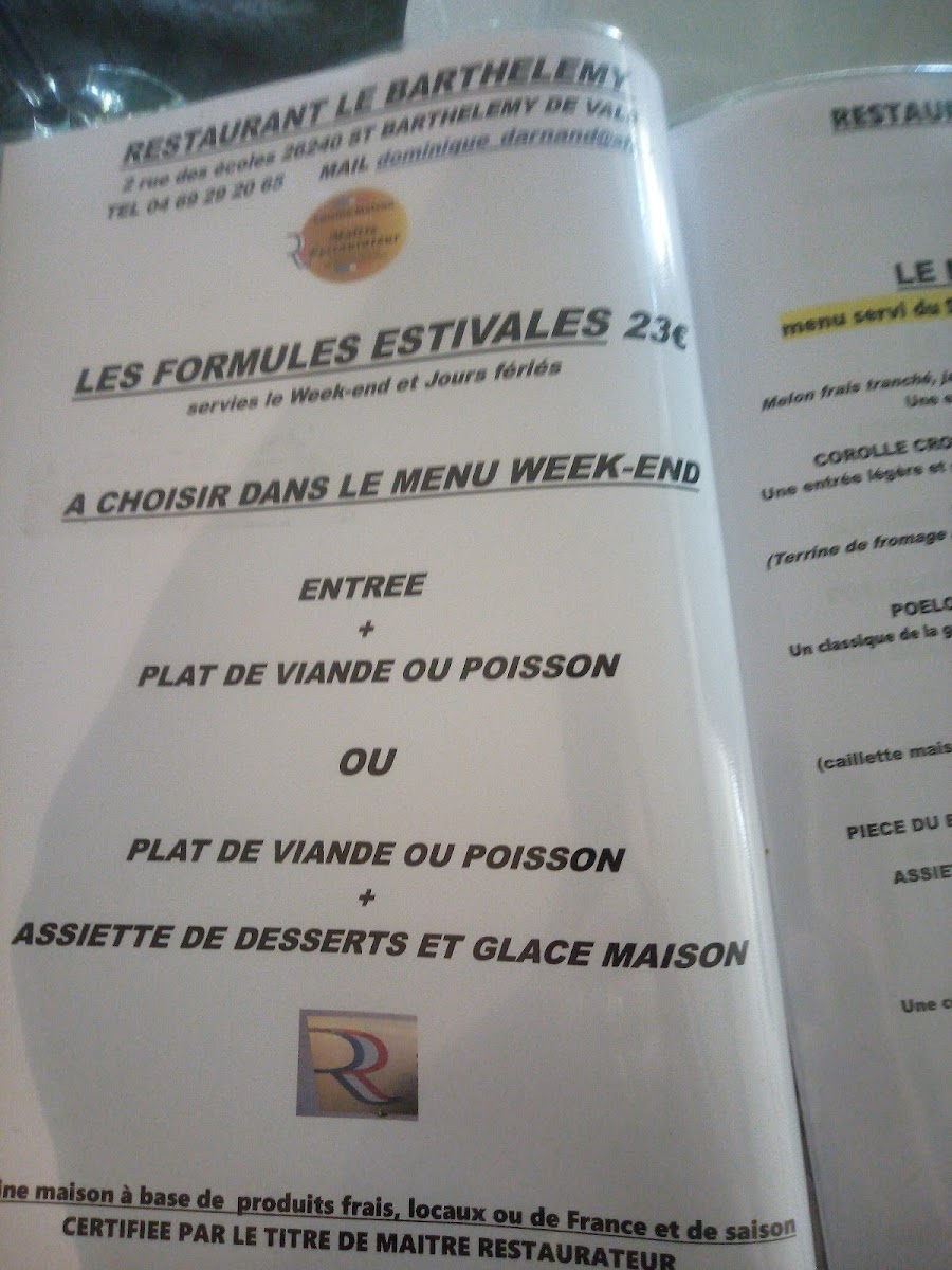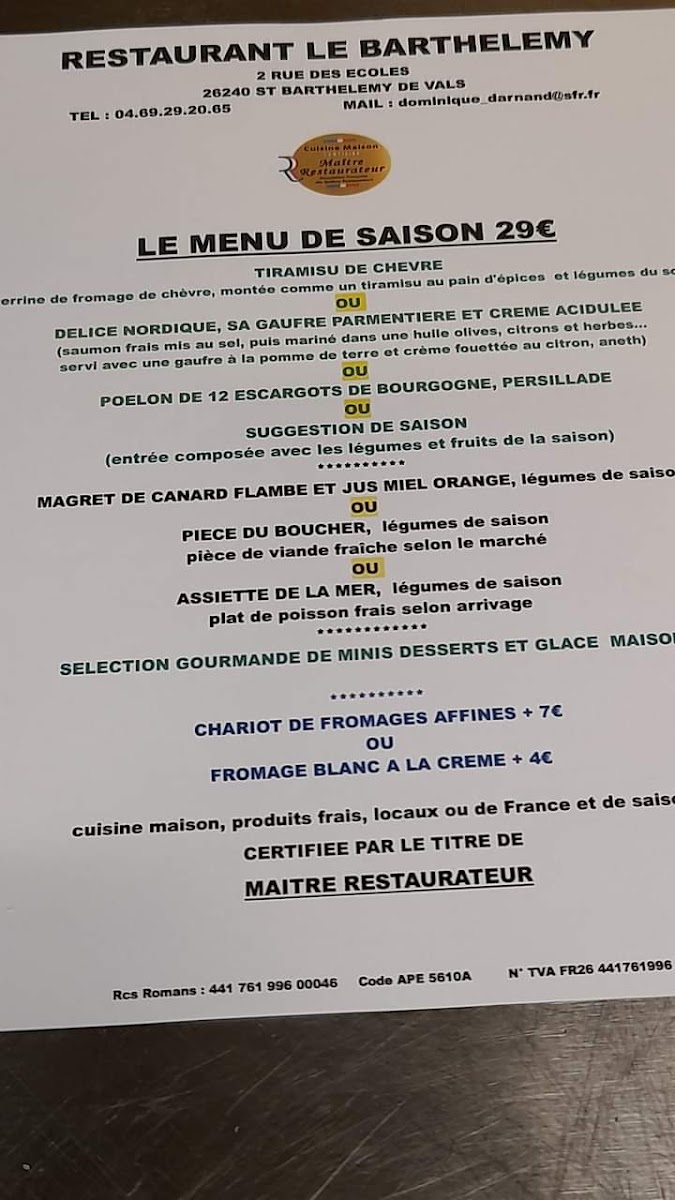 Le Barthélémy offers a delightful array of seasonal dishes that highlight fresh, locally sourced ingredients. The Menu du Marché presents a selection of market-inspired dishes, designed to capture the essence of the region's produce. The Formules du Marché offer a more casual dining experience, featuring dishes like Potatoes and Salmon Tartare and Seasonal Vegetable Salad. For those seeking a refined culinary experience, the Menu de Saison is a must-try, showcasing the best of the season with elegant dishes such as Roast Duck with Honey and Thyme and Grilled Sea Bass. Each menu is thoughtfully curated, offering a perfect balance of flavors, textures, and aromas, making Le Barthélémy a true culinary gem in Saint-Barthélemy-de-Vals. The prices for the menus and dishes are not explicitly listed, but the experience promises to be well worth the investment in quality and taste.